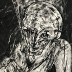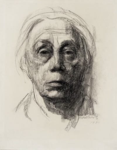 One of the things I love about this self portrait is the variation between line and tone versus the blank space of the paper, as if when to utilize each is perfectly chosen. But also how each type of mark, in different places within the drawing, can perform entirely different functions. Sometimes the lines are just lines, as they are when they depict wrinkles or where the eye’s lids meet the cavity of the eye or strands of hair, and sometimes lines are asked to suggest movement and speed, which we notice particularly in the hair (but also that Kollwitz’s lines tend to move not only in different directions but at different paces from each other) and sometimes the lines are asked to contain shapes, as they do at the top of the head or at the edges of the face or in the solitary line drawn over a blank stretch of paper that depicts her neck. Looking here, we might also note that we often forget that sometimes lines are even asked to hold light.